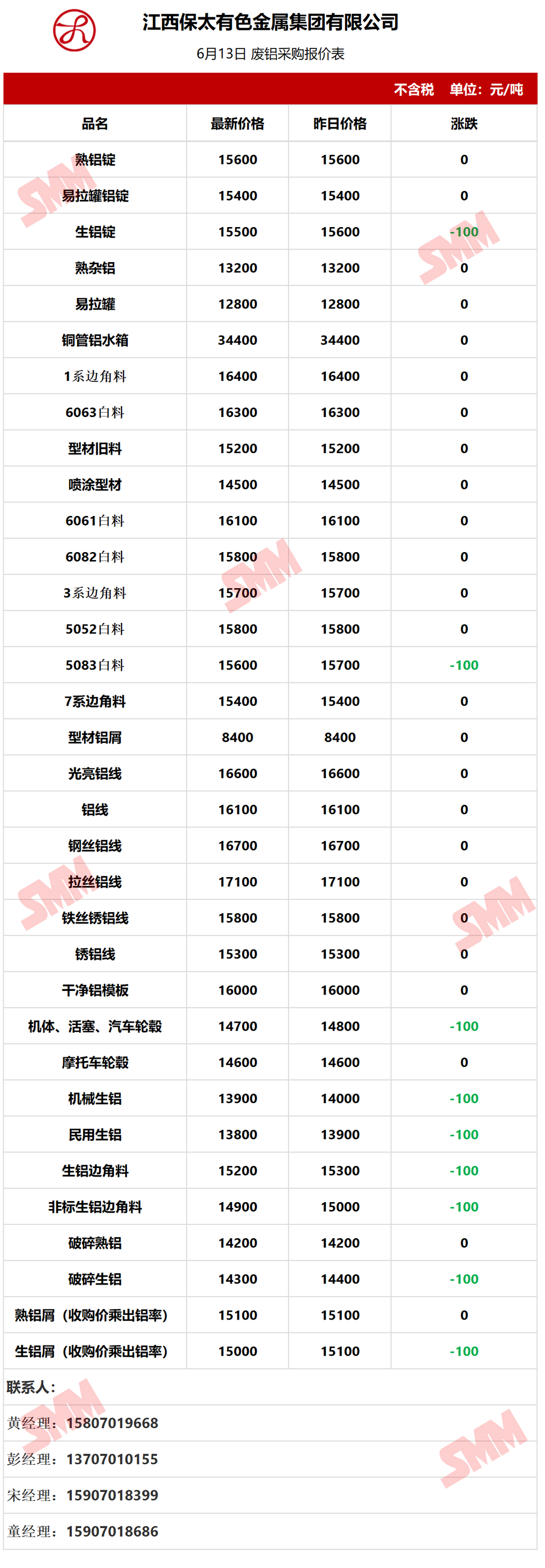 6月13日江西保太 废铝采购报价