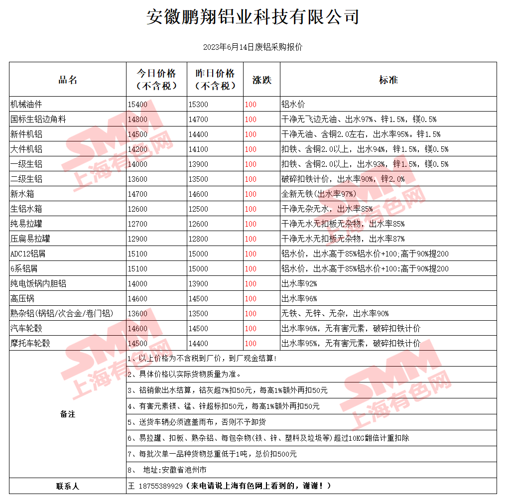 6月14日安徽鹏翔 废铝采购报价