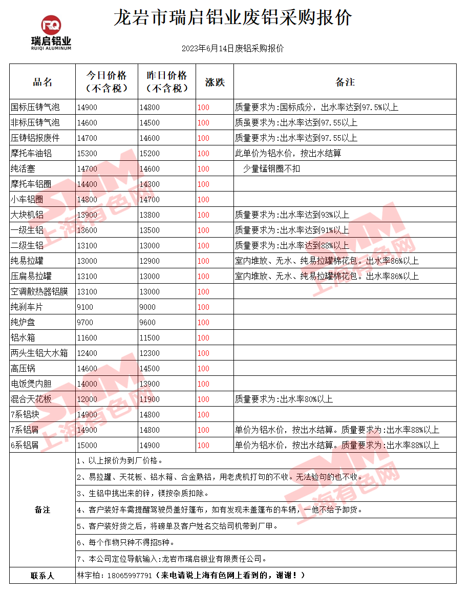 6月14日龙岩瑞启 废铝采购报价
