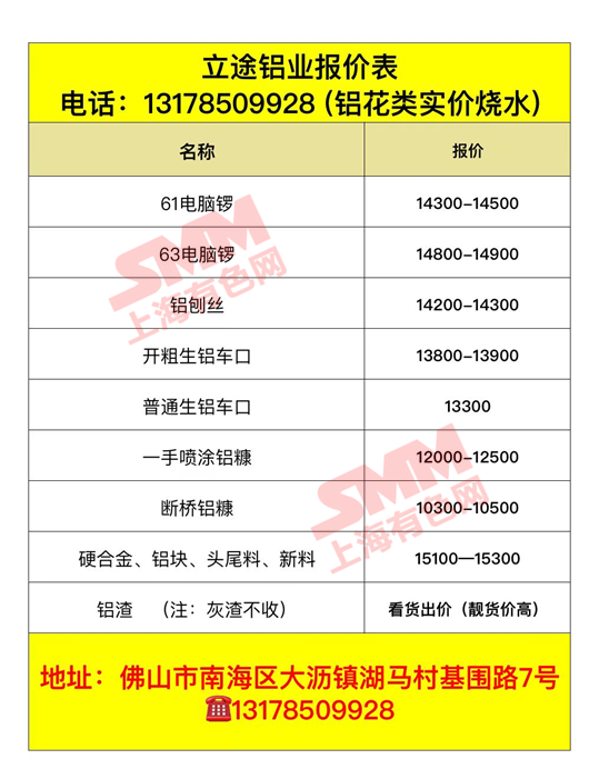 佛山立途铝业有限公司 今日废铝采购报价已更新,有货的欢迎来电咨询。