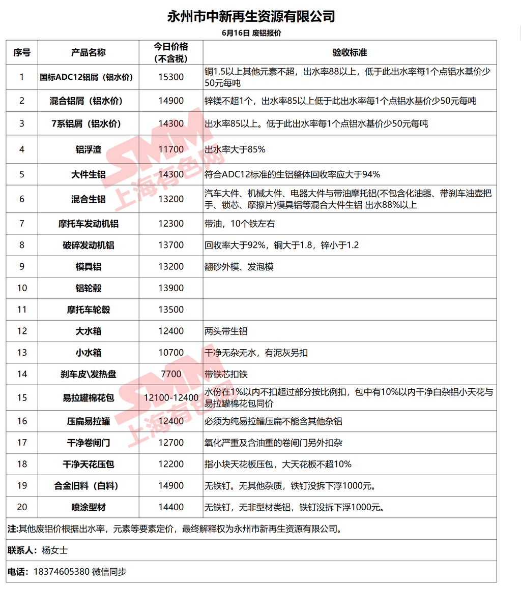 6月16日中新再生 废铝采购报价