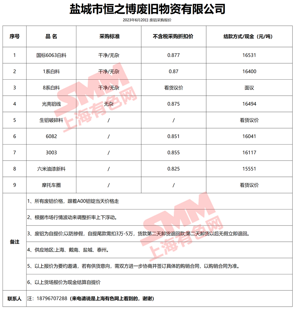6月20日盐城市恒之博 废铝采购报价