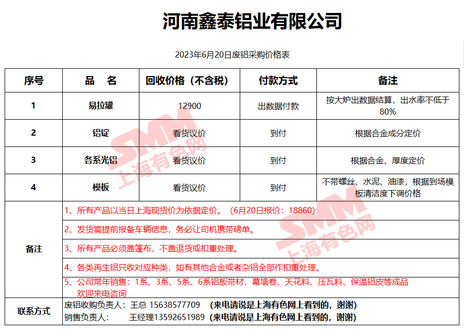 6月20日河南鑫泰铝业 废铝采购报价