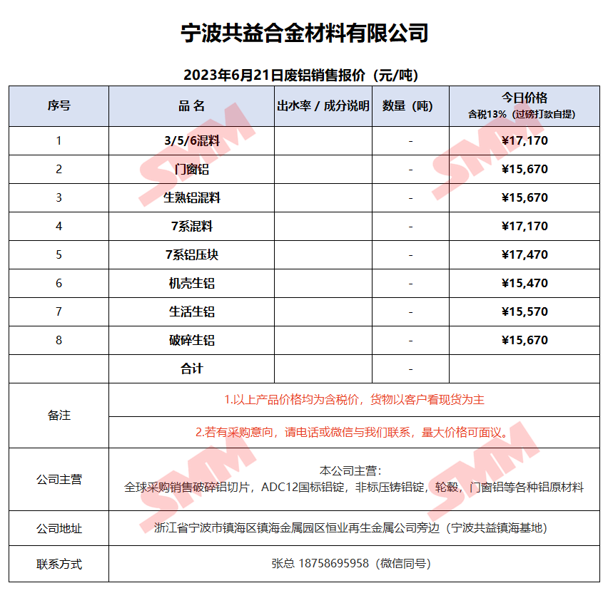 6月21日宁波共益 废铝销售报价