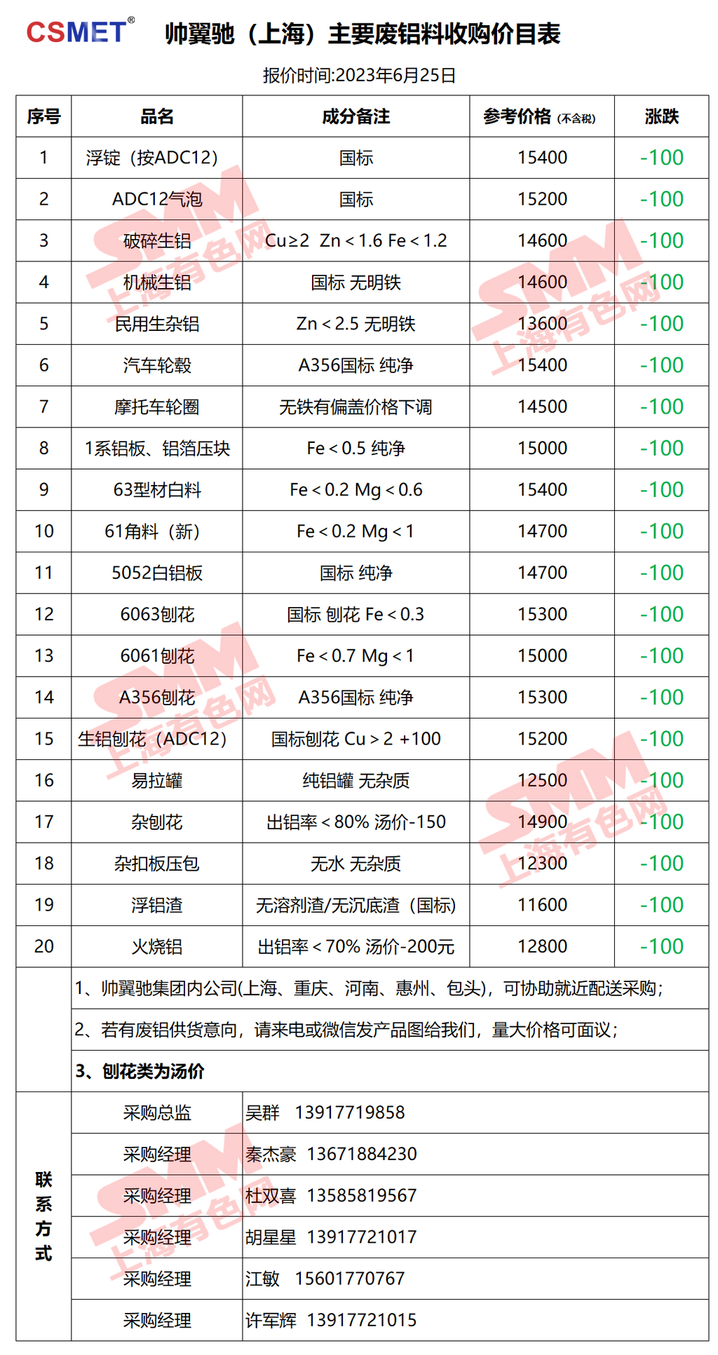 帅翼驰(上海)今日主要废铝料收购价目表已更新,有货的朋友欢迎联系我们!