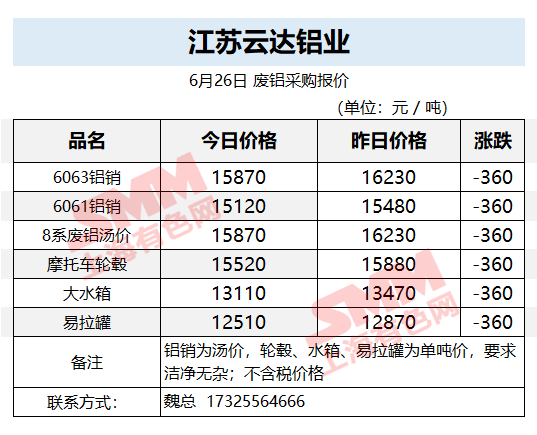 6月26日江苏云达铝业 废铝采购报价