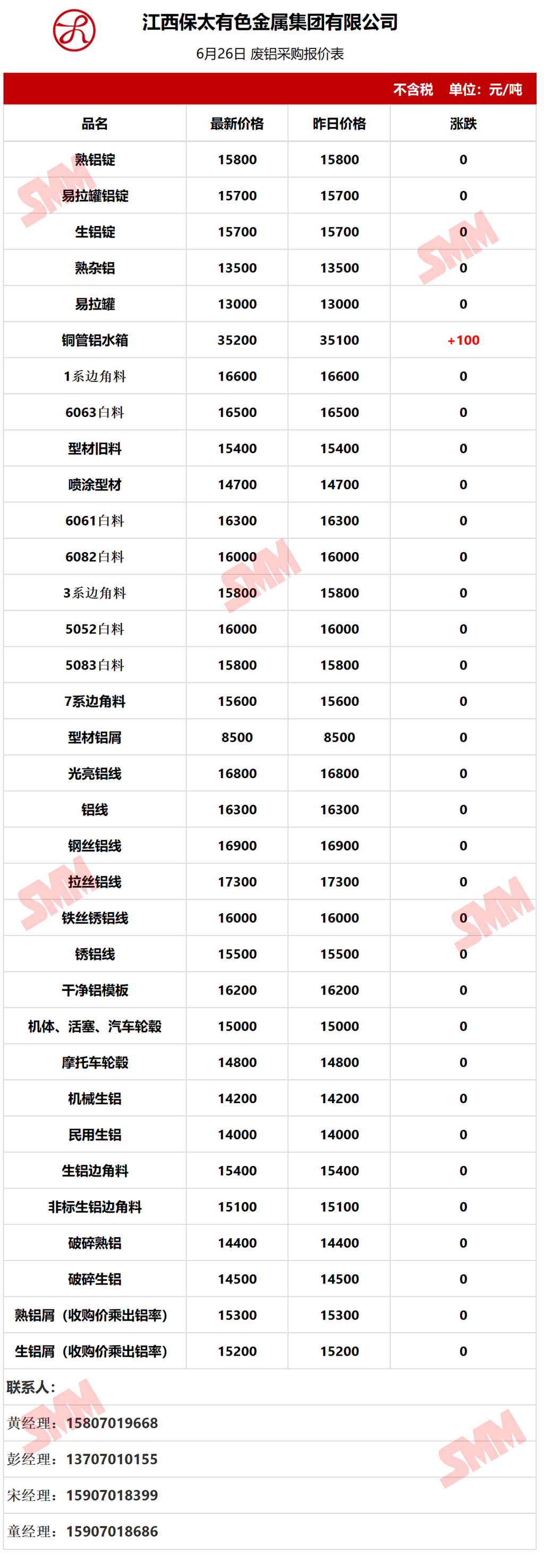 6月26日江西保太 废铝采购报价