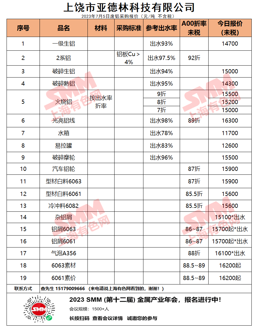 上饶市亚德林今日主要废铝料收购价目表已更新,有货的朋友欢迎联系我们!