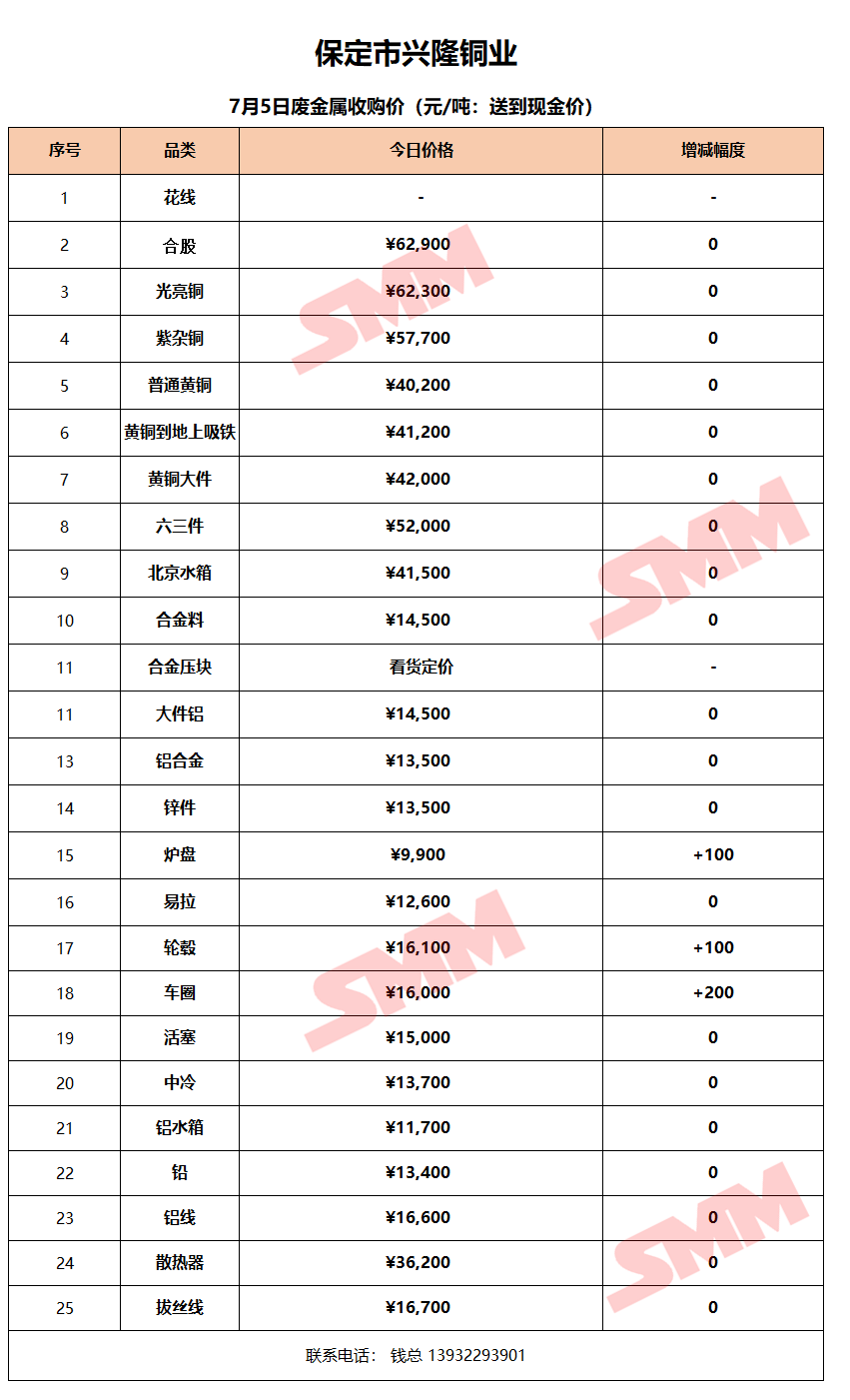 7月5日保定兴隆铜业 废金属收购报价