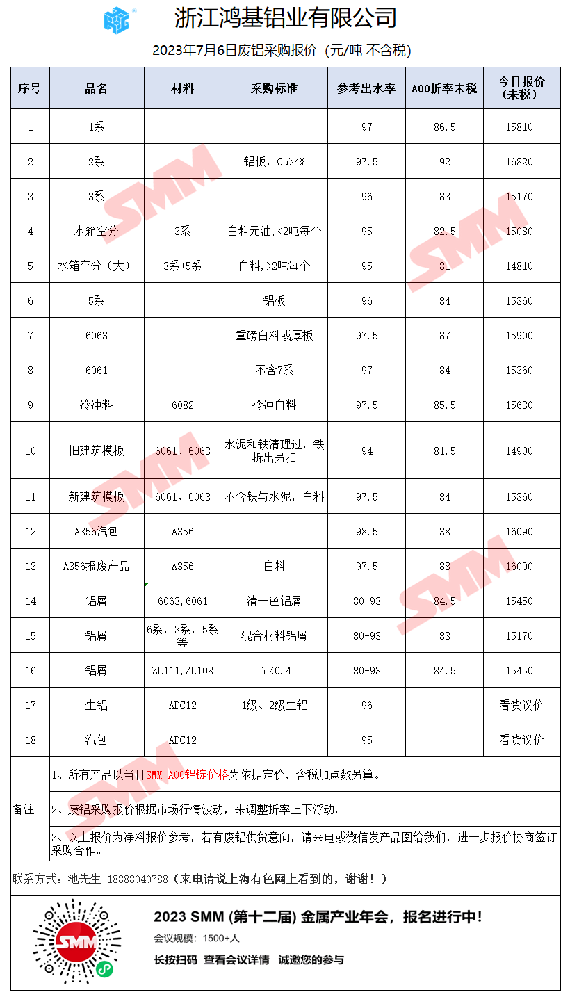 浙江鸿基铝业 今日废铝采购报价已更新,有货的欢迎来电咨询。