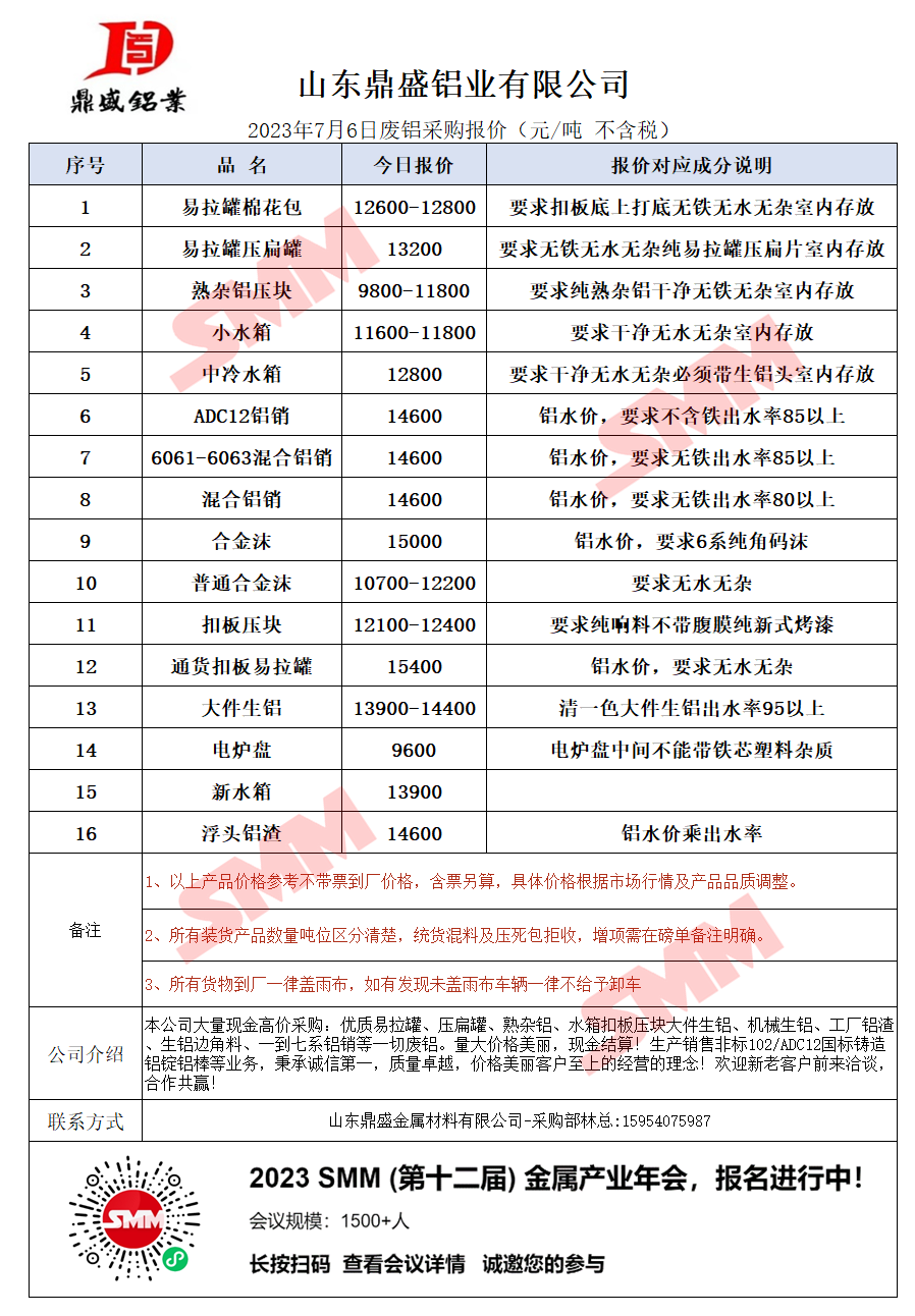 今日山东鼎盛铝业 废铝采购报价已更新,有货的朋友欢迎联系我们!