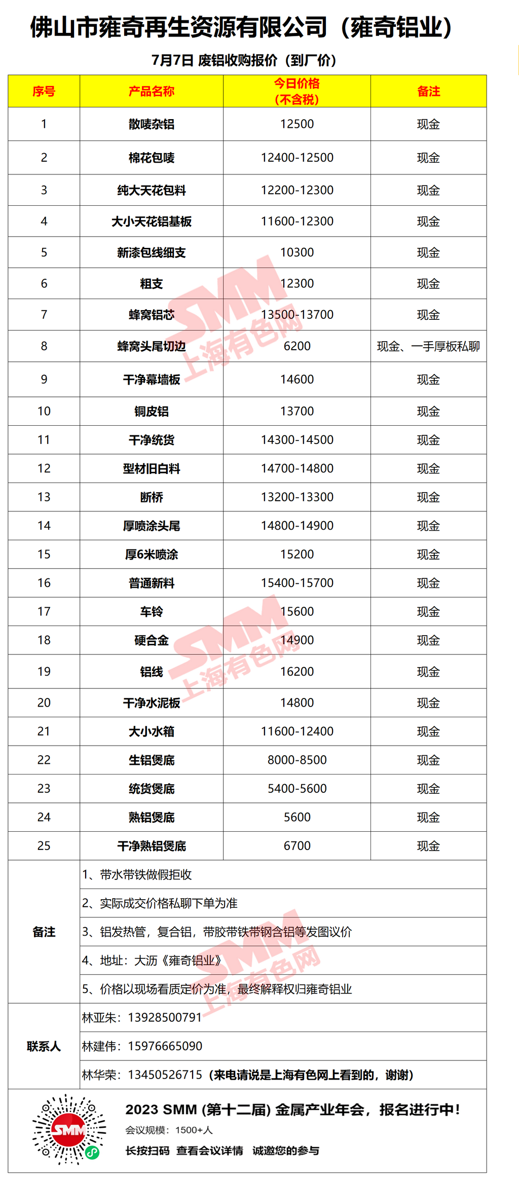 7月7日佛山雍奇 废铝收购报价