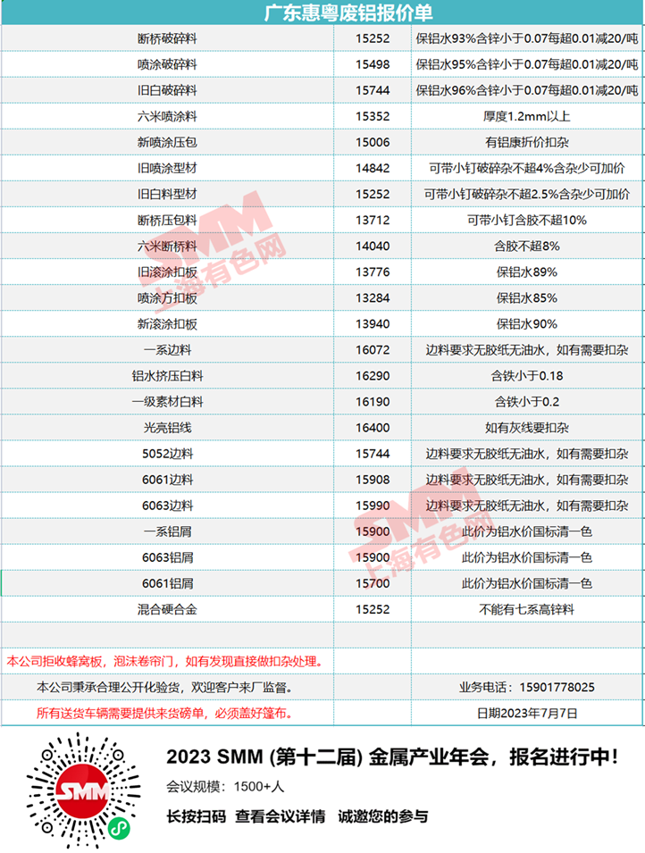 7月7日广东惠粤 废铝收购报价