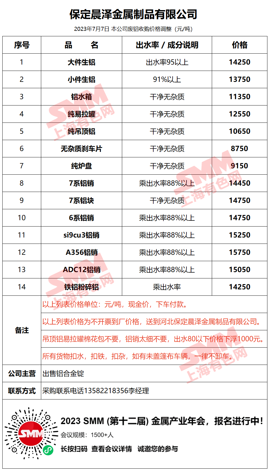 今日保定晨泽金属制品有限公司 废铝采购报价已更新,有货的朋友欢迎联系我们!