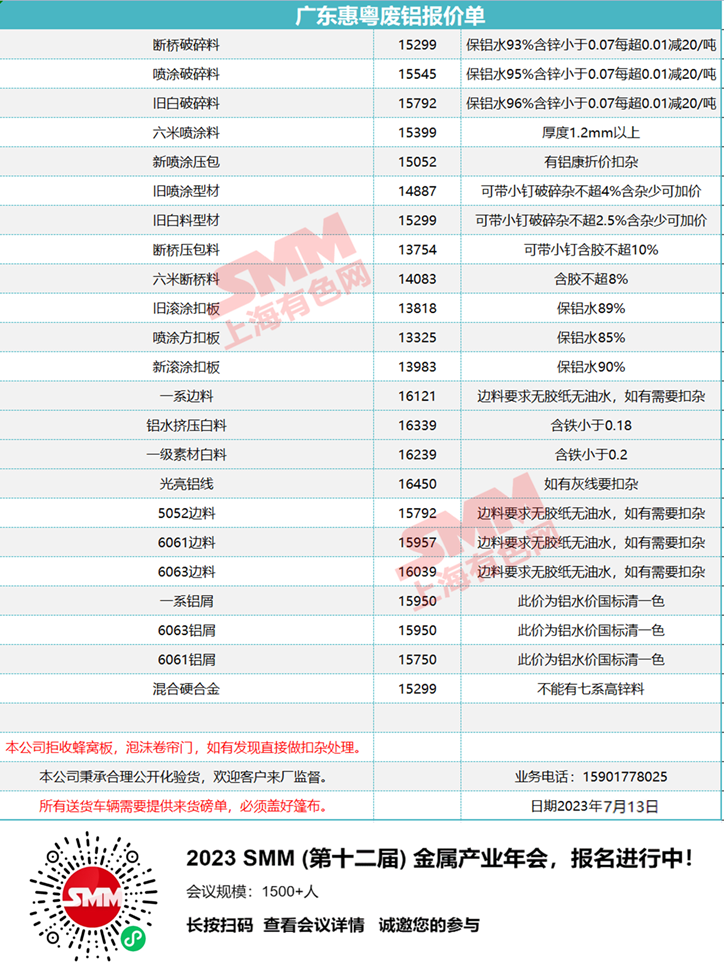7月13日广东惠粤 废铝收购报价