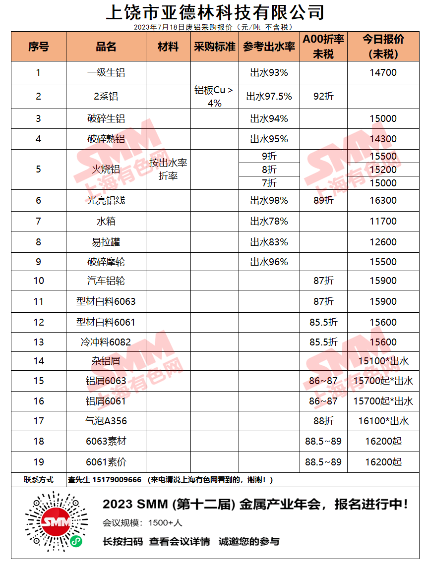 上饶市亚德林今日主要废铝料收购价目表已更新,有货的朋友欢迎联系我们!