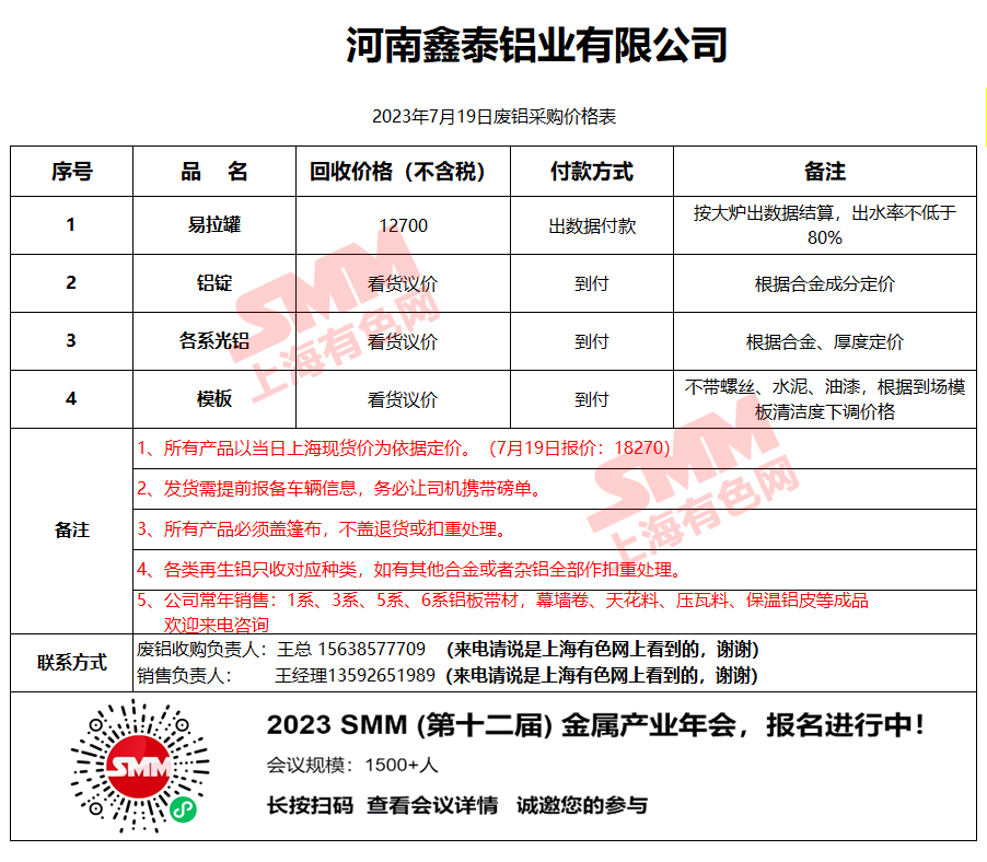 今日河南鑫泰铝业 废铝采购报价已更新,有货的朋友欢迎联系我们!
