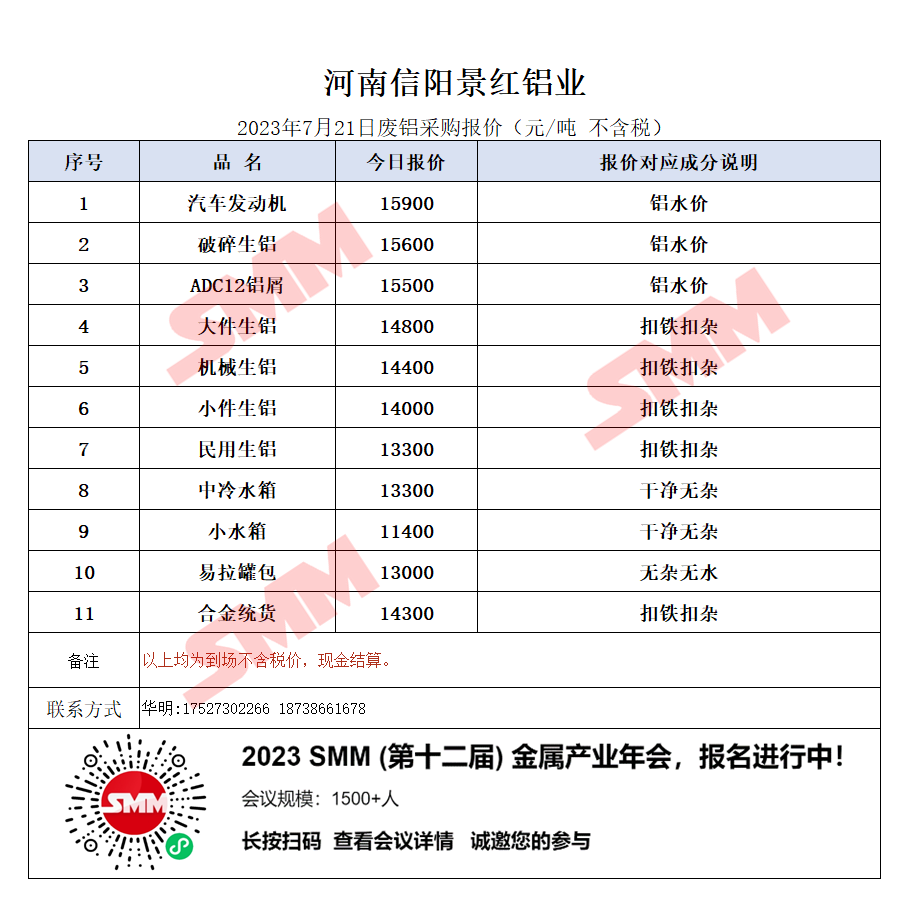 今日河南信阳景红铝业 废铝采购报价已更新,有货的朋友欢迎联系我们!