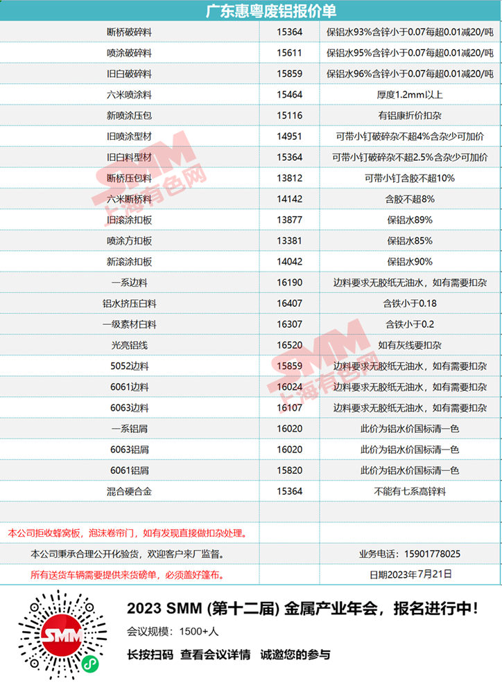 广东惠粤今日主要废铝料收购价目表,有废铝出货的朋友,请与我们联系。