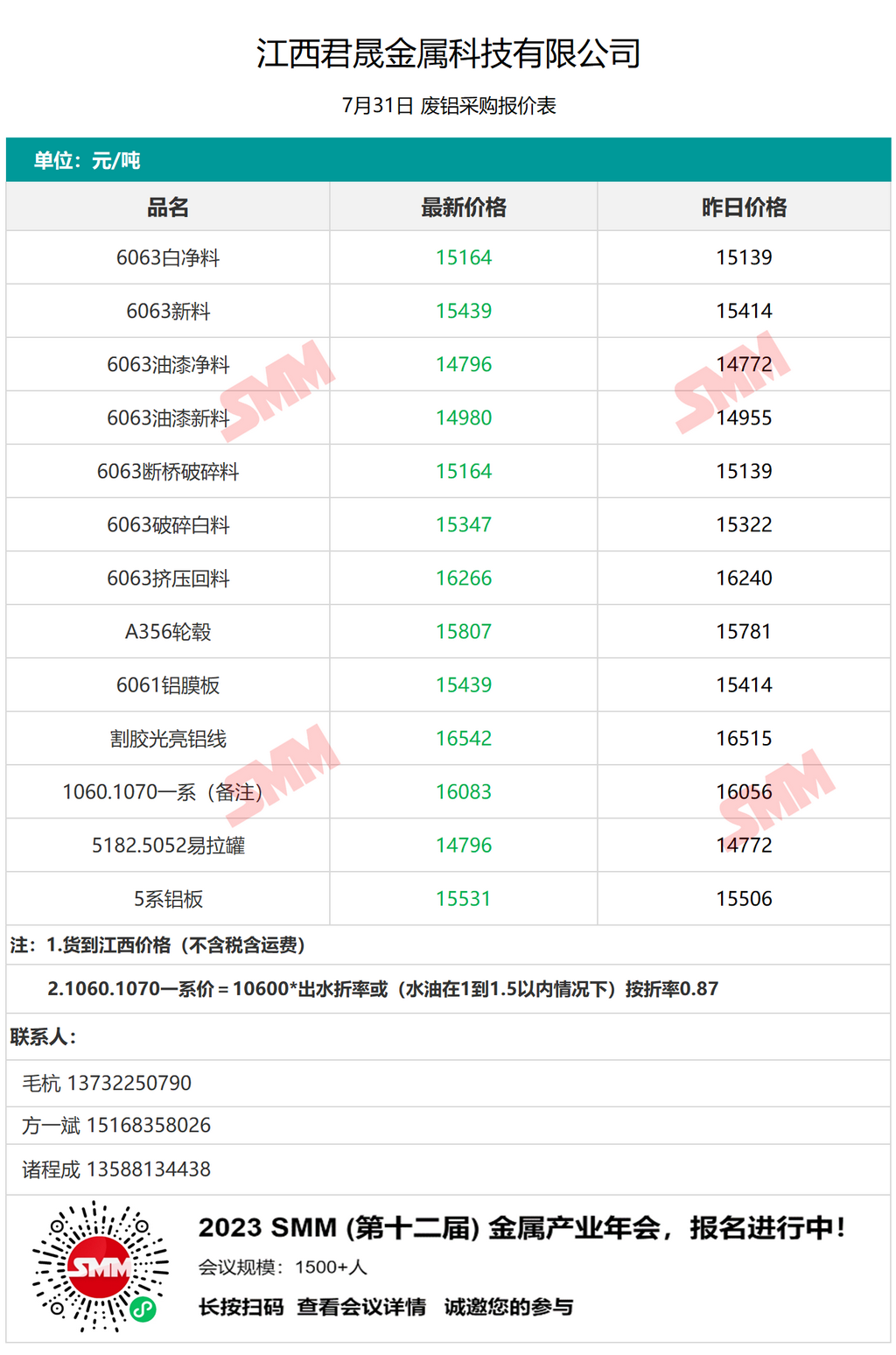 7月31日江西君晟金属 废铝采购报价