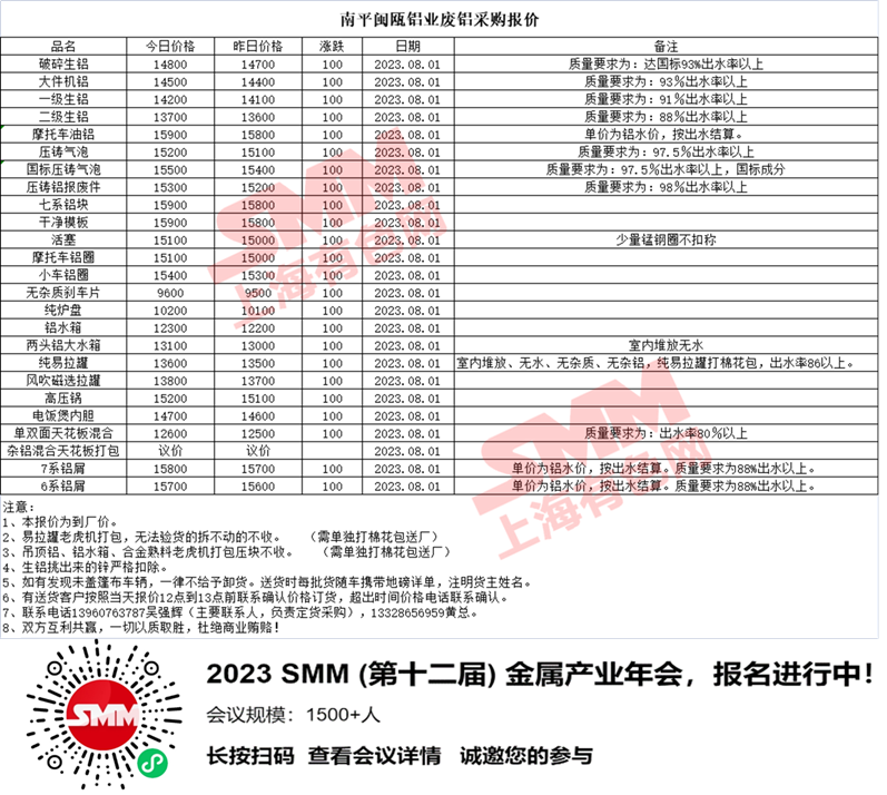 8月1日南平闽瓯 废铝采购报价