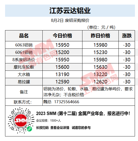今日江苏云达铝业 废铝采购报价已更新,有货的朋友欢迎联系我们!