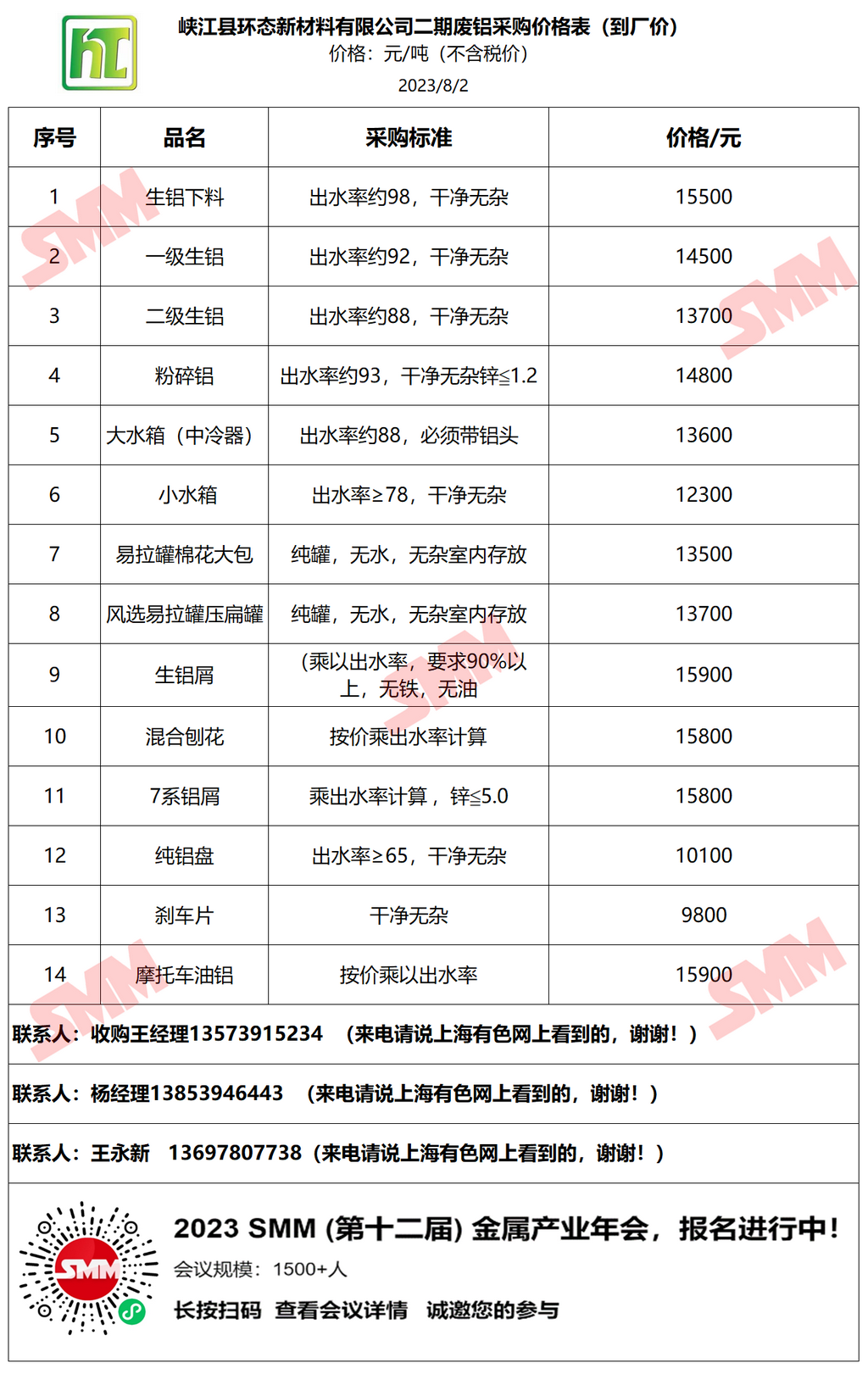 8月2日峡江环态 废铝采购报价