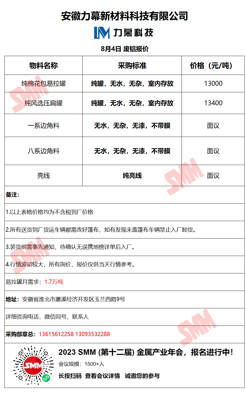 今日安徽力幕新材料科技有限公司 废铝采购报价已更新,有货的朋友欢迎联系我们!