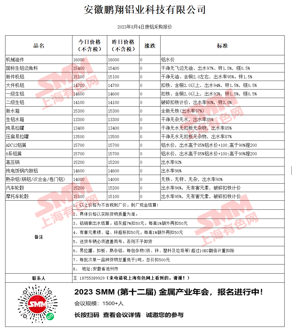 今日安徽鹏翔 废铝采购报价已更新,有货的朋友欢迎联系我们!