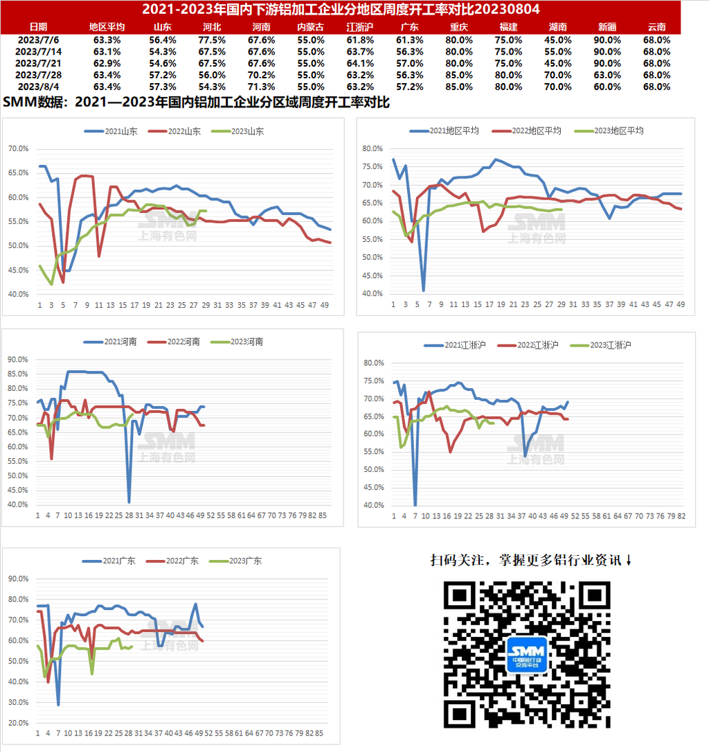 【SMM铝下游周度调研:华北洪水暂未波及铝下游生产 周内开工持稳为主】本周国内铝下游加工龙头企业开工率环比上周持稳于63.4%,与去年同期相比下滑2.1个百分点。周内各版块开工率涨跌互现,线缆企业在国网交货需求增加带动下开工率小幅回涨,而型材方面......