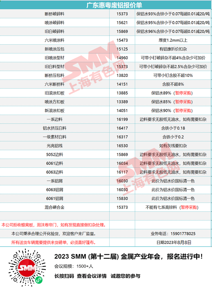 广东惠粤今日主要废铝料收购价目表,有废铝出货的朋友,请与我们联系。