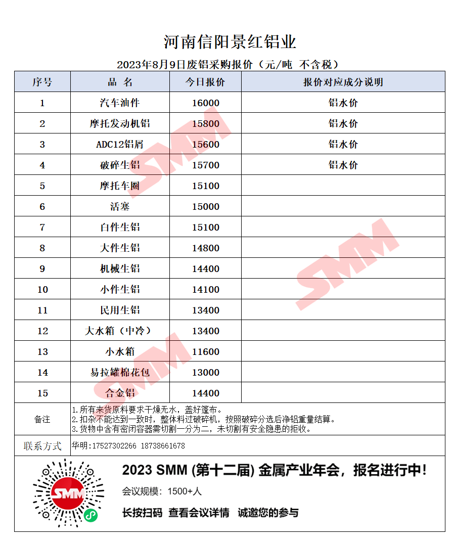 今日河南信阳景红铝业 废铝采购报价已更新,有货的朋友欢迎联系我们!