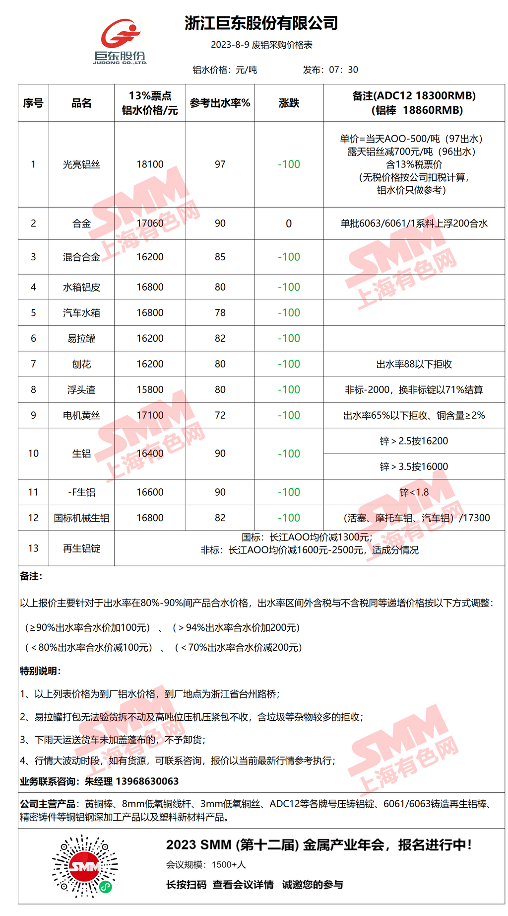 今日浙江巨东 废铝采购报价已更新,有货的朋友欢迎联系我们!