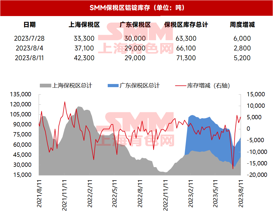 2023年8月11日电解铝保税区库存:库存增加【SMM数据】