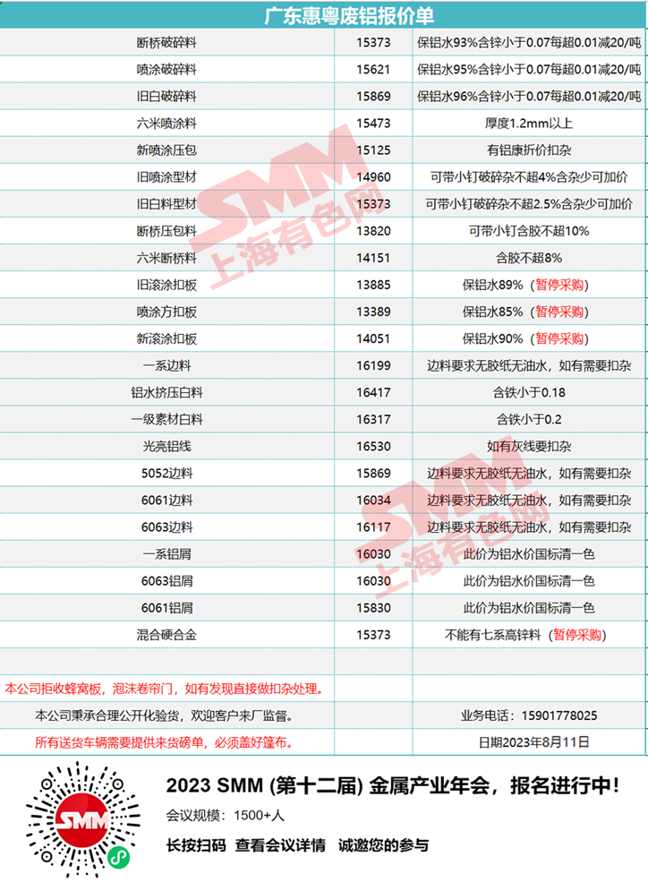 广东惠粤今日主要废铝料收购价目表,有废铝出货的朋友,请与我们联系。