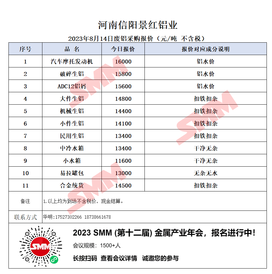 今日河南信阳景红铝业 废铝采购报价已更新,有货的朋友欢迎联系我们!