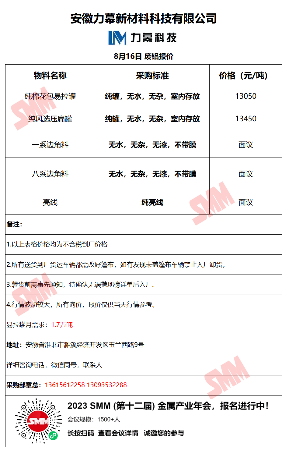 今日安徽力幕新材料科技有限公司 废铝采购报价已更新,有货的朋友欢迎联系我们!