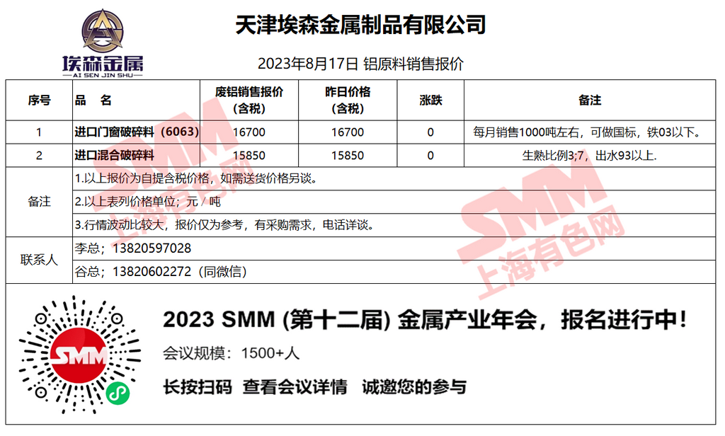 今日天津埃森 废铝销售报价已更新,有采购意向的朋友欢迎联系我们!