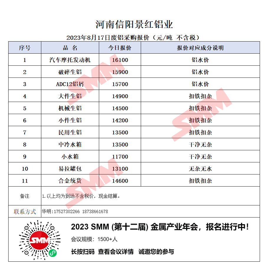 今日河南信阳景红铝业 废铝采购报价已更新,有货的朋友欢迎联系我们!
