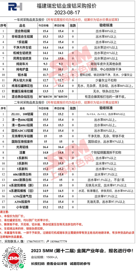 今日福建瑞宏 废铝采购报价已更新,有货的朋友欢迎联系我们!