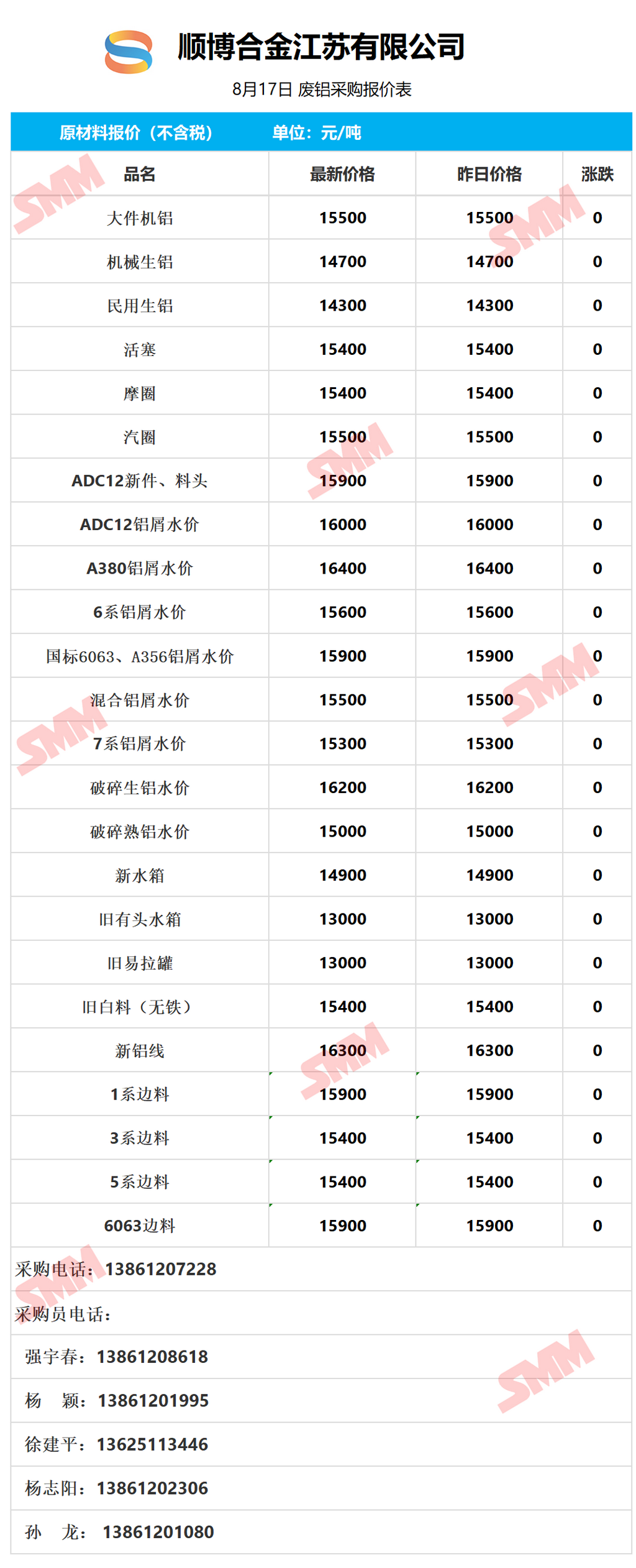 今日顺博合金江苏废铝采购报价已更新,有货的朋友欢迎联系我们!