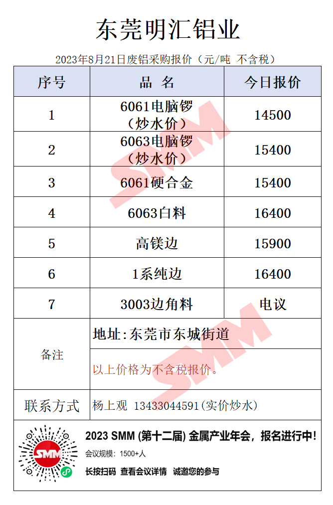 今日东莞明汇铝业 废铝采购报价已更新,有货的朋友欢迎联系我们!