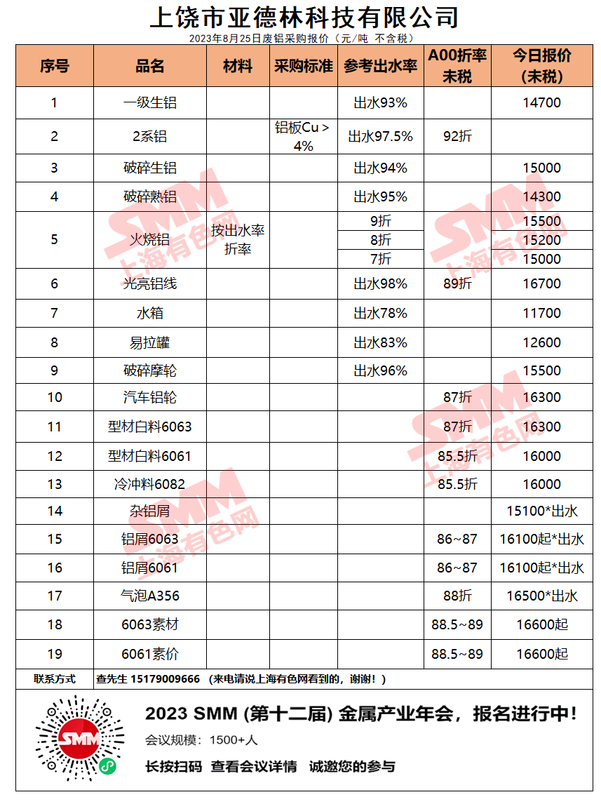 上饶市亚德林今日主要废铝料收购价目表已更新,有货的朋友欢迎联系我们!