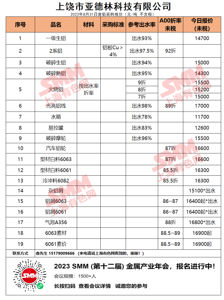 上饶市亚德林今日主要废铝料收购价目表已更新,有货的朋友欢迎联系我们!