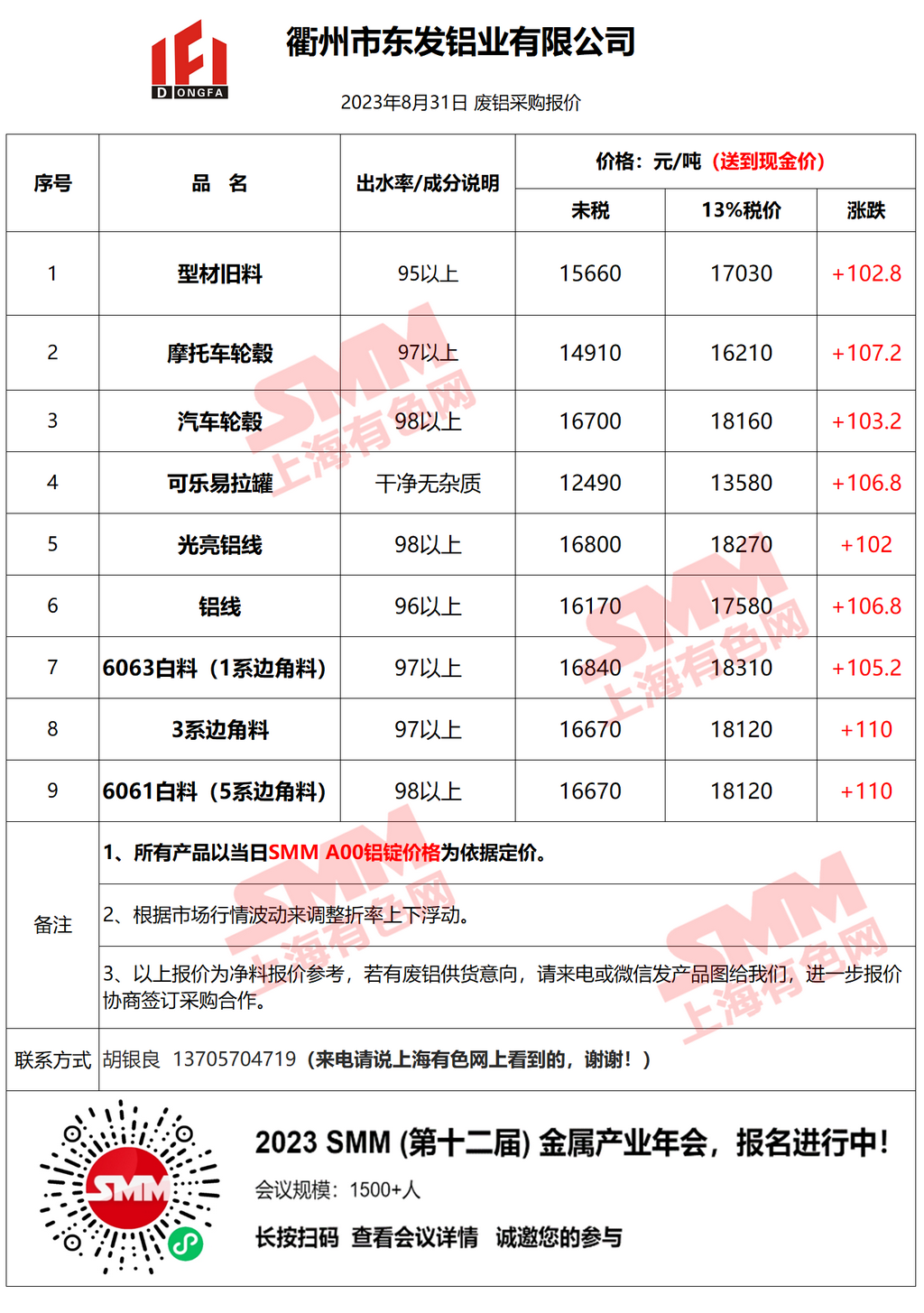 今日衢州东发 废铝采购报价已更新,有货的朋友欢迎联系我们!