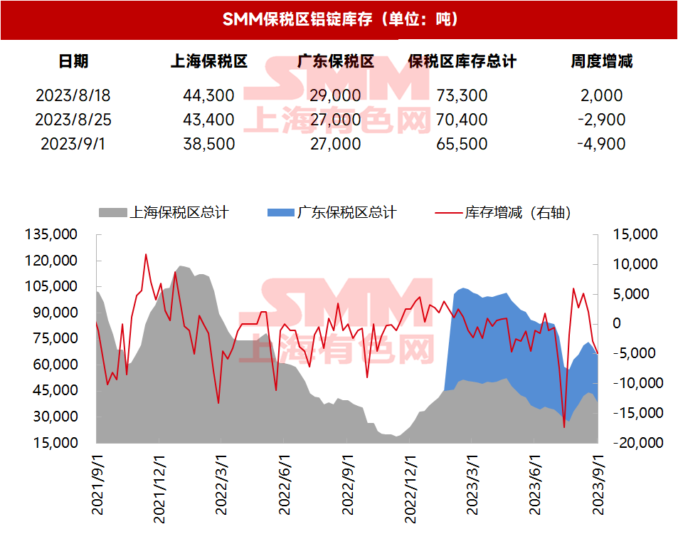 2023年9月1日电解铝保税区库存:库存周度环比减少【SMM数据】