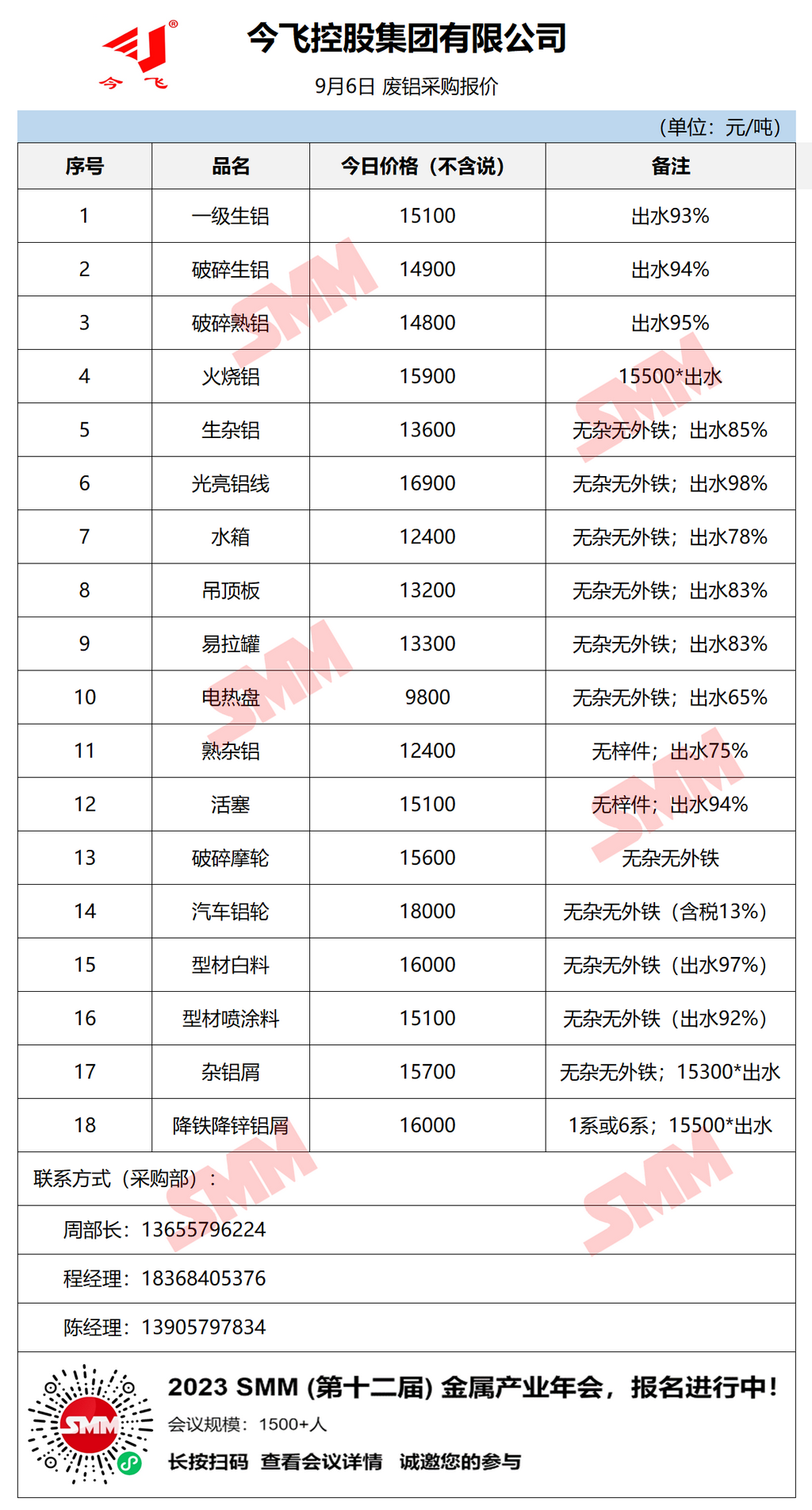 9月6日今飞集团 废铝采购报价