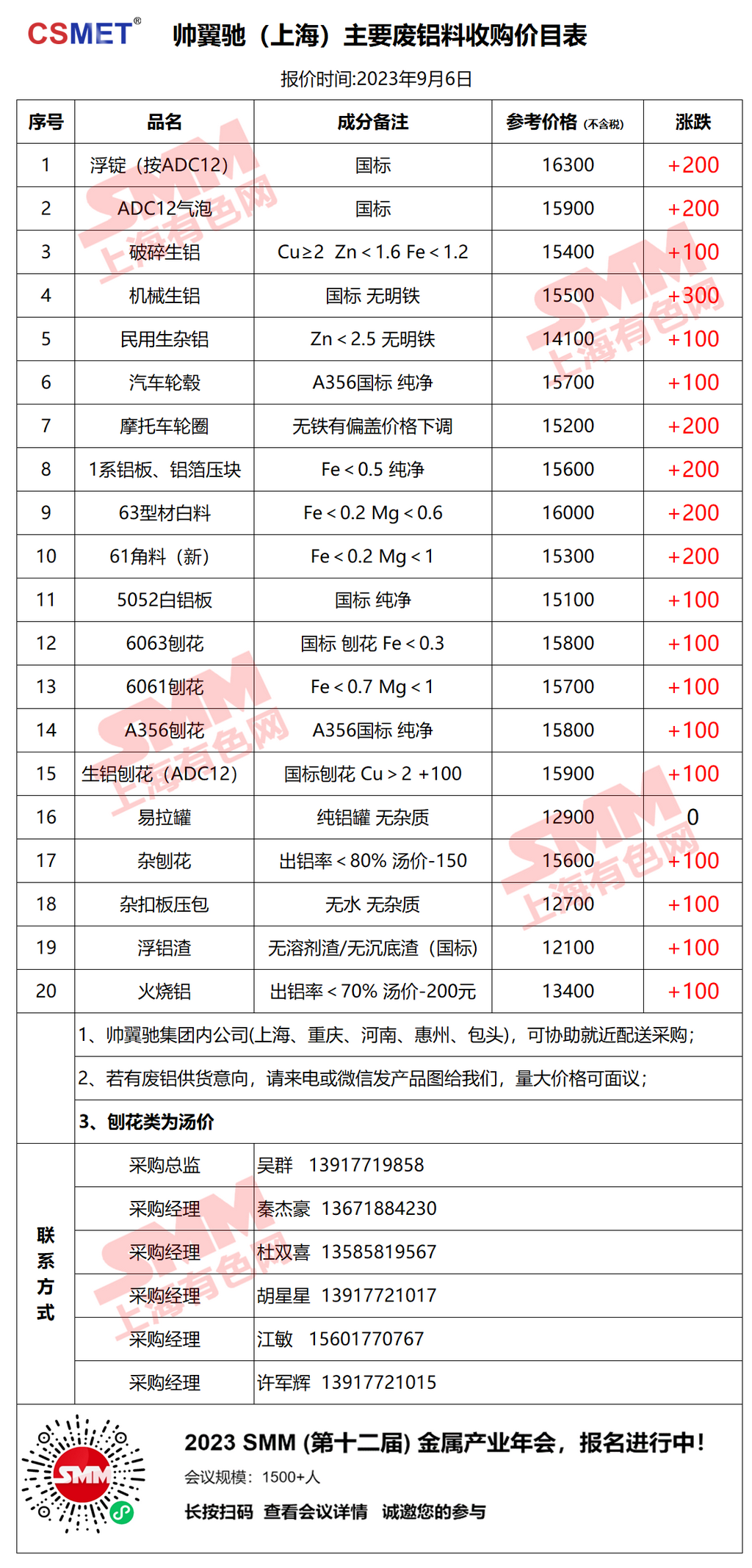 帅翼驰(上海)今日主要废铝料收购价目表已更新,有货的朋友欢迎联系我们!