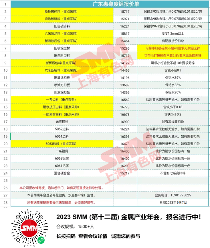 广东惠粤今日主要废铝料收购价目表,有废铝出货的朋友,请与我们联系。