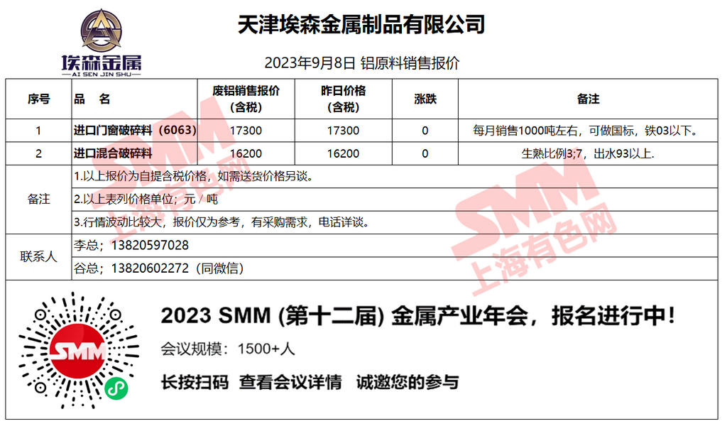 9月8日天津埃森 废铝销售报价
